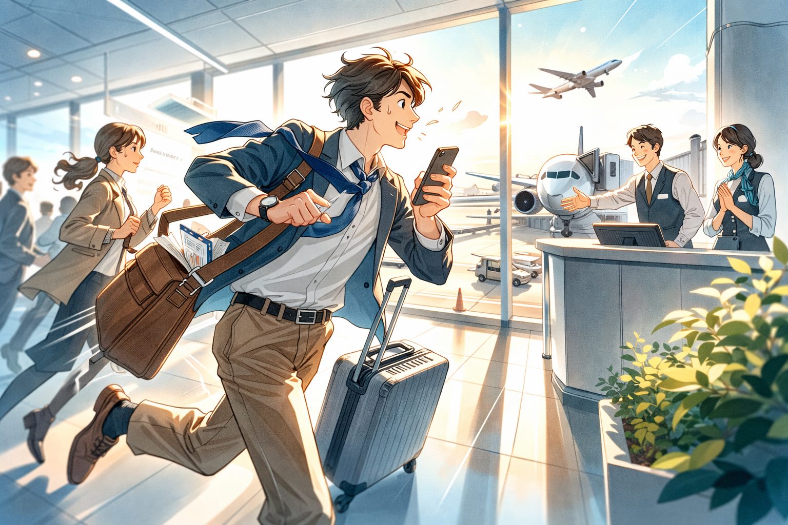 「間に合わない」と気づいた瞬間にかけるのが正解です。出発30分前でも、20分前でも、遅すぎることはありません。電話することで空港スタッフへの事前共有が可能になり、搭乗できる可能性がわずかでも上がります。